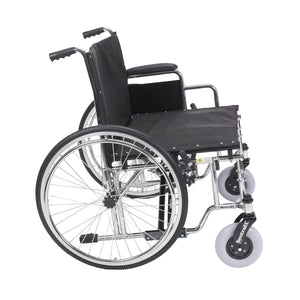 The stylish triple chrome coated steel frame and steel spoke wheels add a touch of elegance to this bariatric wheelchair. This Sentra EC Extra Wide Heavy Duty Wheelchair comes with detachable desk arms and a 26", 28" or 30" wide seat.
