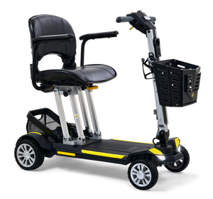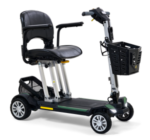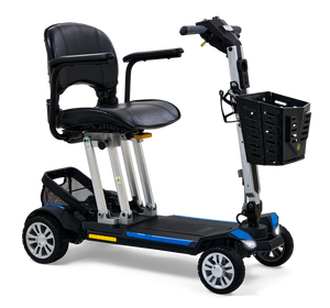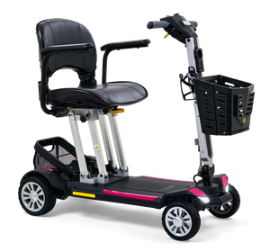 The Buzzaround Carry On foldable scooter is small in stature and big on fun! This new sporty, super portable scooter will take you where you want to go in comfort and style! It features an infinitely adjustable tiller, full front and rear lighting package, lithium-ion travel battery and 300 lb. weight capacity. The heaviest piece is 47.5 lbs. (without seat and batteries) and the height when folded is only 12”. This lightweight, folding mobility scooter disassembles easily into two pieces and is designed to store in the smallest compartments. Pack your dreams and go anywhere with the Carry On travel scooter!**