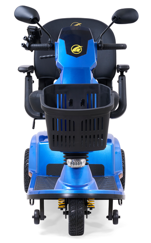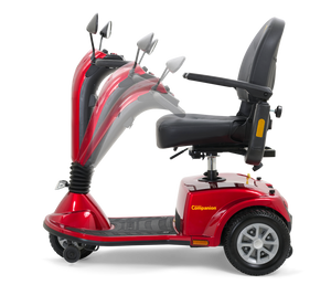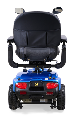 Golden’s popular Companion 3-wheel scooter has a sporty new look and upgraded comfort features! This next-generation model has a well-designed, wider infinite adjustable tiller with a digital dashboard featuring a percentage battery life indicator and water-resistant buttons on the control panel, plus two convenient cup holders. It offers ample leg and foot room on the wide front deck and full front and rear suspension for a smooth ride. The luxurious high back stadium-style seat with a quilted diamond stitch pattern and extra padding elevates the level of comfort and style while on the go! The sliding swivel seat is 18” wide by 16” deep.