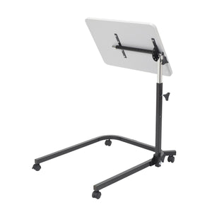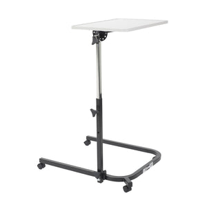 The Drive Medical Deluxe pivot and tilt overbed table is designed to meet the needs of many different users. The adjustable pivot and tilt arm allows this overbed table to be height, angle and tilt adjusted providing a versatile table with the ability to be used in many different applications. The table top is easy to clean, features a stylish grey finish and raised outer lining to prevent items from sliding off. The frames U base and pivot arm allows wheelchair users to position the table top within comfortable reach compared to traditional overbed tables. The mast of the table pivots, and it can lock flat on the floor or at 90 degrees ensuring a flat table surface no matter the mast's positions. Four 2" casters allow for easy transportation, with two locking safely into place for security and stability. This overbed table folds flat for easy storage in tight spaces when not in use.