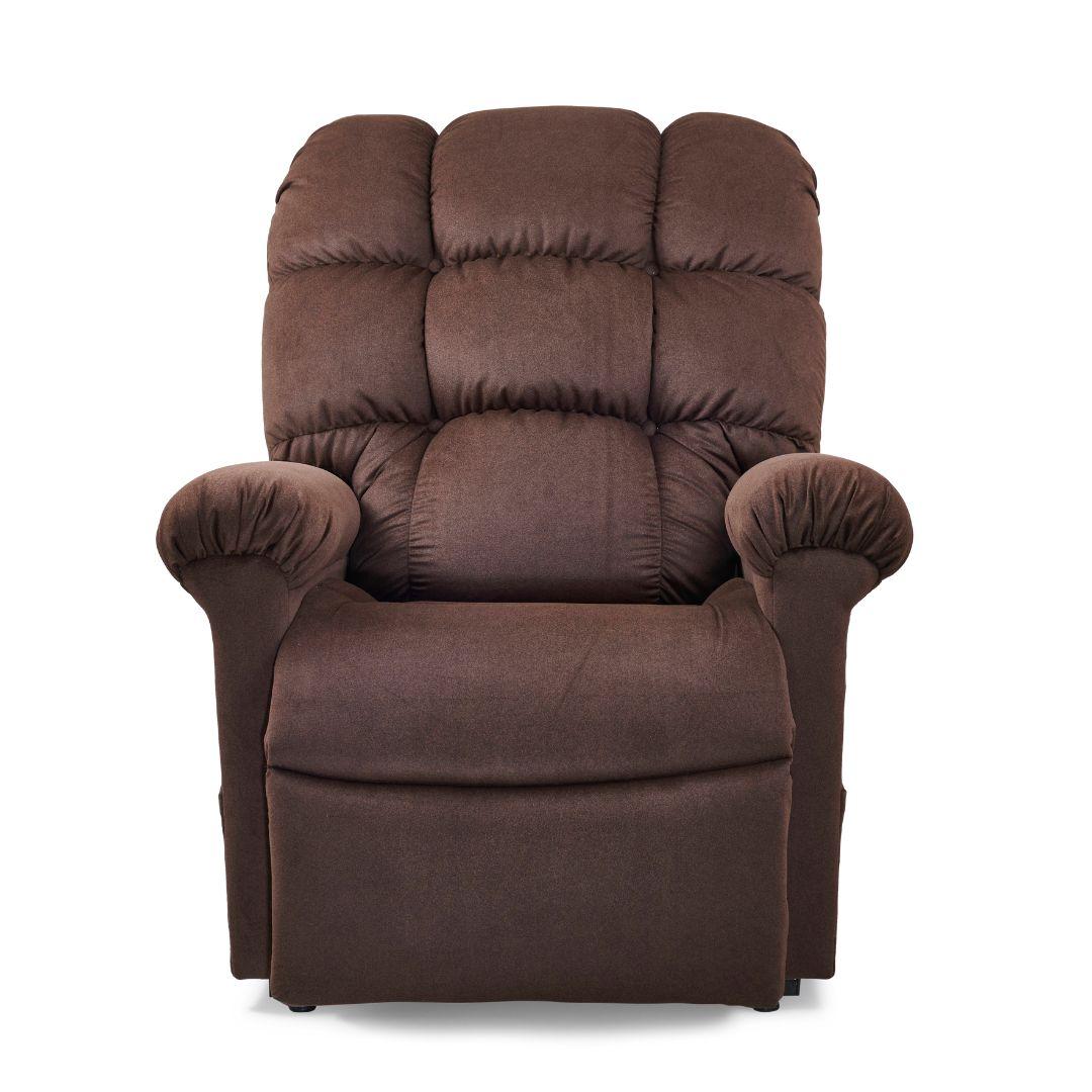 Specification Med/Large Overall Width: 38" Overall Height: 45" Seat Width: 20" Seat Depth: 21.5" Seat to Floor Height: 20" Seat to Back Height: 32" Seat to Arm Height: 8.5" Distance Required from Wall Reclined: 26.5" Back of Seat to End of Footrest Reclined: 46" Weight Capacity: 375 lbs. Battery Backup: 9 volt Standard Warranty Chair Frame: Lifetime Lift Frame: Lifetime Recline Mechanism: Lifetime Electrical Parts: 3 years Mechanical Labor: 3 years Electrical Labor: 1 year Brisa® fabric offers the refined look of leather, but in a luxuriously soft, breathable, and temperate design.Brisa®, the world’s first breathable polyurethane fabric, comes in an extensive selection of lovely colors to choose from and will never stick to you or feel too hot or cold. This beautiful fabric is scratch resistant and easy to clean and disinfect, so it always stays looking new!These fabrics are double rubbed 300,000 times to ensure the highest level of quality and durability.We’re so sure of the quality of this fabric, that Golden offers a Lifetime Warranty* on all Brisa® fabrics.