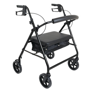 The Protekt® Bariatric Rollator provides stability and independence for larger individuals. The frame is constructed with extra strength reinforced steel and has large reinforced forks. The 8" wheels provide improved maneuverability and safety. Equipped with easy-to-operate ergonomic hand brakes, a removable padded backrest and a water-resistant nylon pouch. Easily folds for storage and transport with built-in fold strap. Supports patient weights up to 500 pounds.