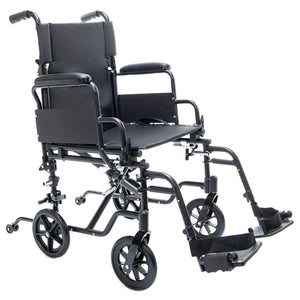 The Protekt Cambria™ High Strength Lightweight Convertible Transport Chair/Wheelchair can be used as a standard, self-propelled wheelchair or as a transport chair, all-in-one for your convenience. The quick release 24” wheels can be easily removed to transition from a wheelchair to a transport chair. Also comes with two sets of aluminum wheel locks, one for use with wheelchair and one for use with transport chair, for added safety. The deluxe back release folds down the backrest for easy and convenient storage and transportation. Dual brakes, desk length removable armrests, a fold-down backrest and swing-away removable footrests all combine to make for a portable and high-quality chair, with great flexibility for both user and caregiver.